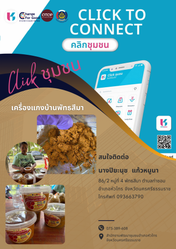 สำนักงานพัฒนาชุมชนอำเภอหัวไทร นางสาวอัจจิมา มุสิกะพันธุ์ พัฒนาการอำเภอหัวไทร มอบหมายให้มอบหมายให้นางกิติยาวรรณ ขวัญคง นักวิชาการพัฒนาชุมชนปฏิบัติการ จัดทำสื่อประชาสัมพันธ์ร้านค้าใน Shop ชุมชน เพื่อเชิญชวนผู้ที่สนใจเข้าชม ช็อปสินค้า OTOP ของอำเภอหัวไทร จังหวัดนครศรีธรรมราช เพื่อสร้างรายได้สู่ชุมชน ผ่านแอปพลิเคชัน Click ชุมชน โดยคลิกที่เมนู Shop ชุมชน และขอเชิญชวนผู้ที่สนใจ ดาวน์โหลดแอปพลิเคชัน Click ชุมชน ซึ่งมีเมนูบริการมากกว่า 13 เมนู “แอปเดียวจบ ครบเรื่องชุมชน” เรียนรู้ ดู เที่ยว ทั่วไทย ไปกับ Click ชุมชน