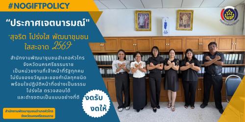 สำนักงานพัฒนาชุมชนอำเภอหัวไทร นำโดยนางสาวอัจจิมา มุสิกะพันธุ์ พัฒนาการอำเภอหัวไทร พร้อมด้วย เจ้าหน้าที่พัฒนาชุมชนอำเภอหัวไทร ประกาศเจตนารมณ์ "สุจริต โปร่งใส พัฒนาชุมชนใสสะอาด ๒๕๖๙" และ "งดรับ งดให้" ของขวัญของกำนัลทุกชนิดจากการปฏิบัติหน้าที่ (No Gift Policy) เพื่อปลูกฝังค่านิยมในการปฏิบัติงานด้วยความซื่อสัตย์สุจริต และเป็นไปตามหลักธรรมาภิบาล เสริมสร้างค่านิยมประหยัดตามหลักปรัชญาของเศรษฐกิจพอเพียงและเป็นมาตรการภายในเพื่อป้องกันการทุจริต